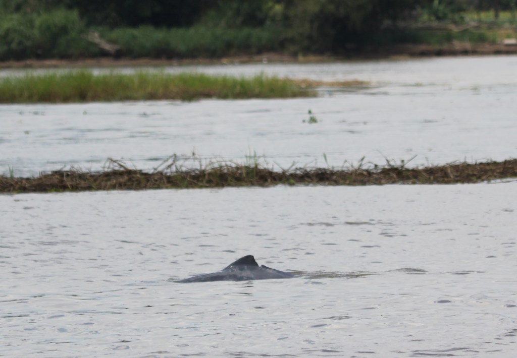 And there was indeed a pesut. One individual, foraging, in water littered with water hyacinth and other debris. Rarely easy to get a photo of one solitary pesut foraging…